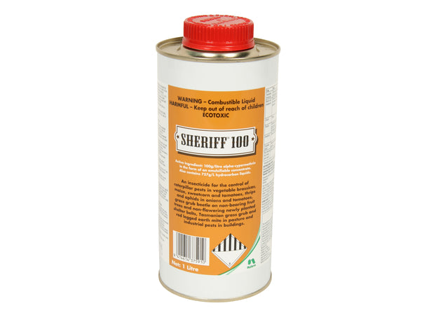 Sheriff 100 is an insecticide for the control of caterpillar pests in vegetable brassicas, maize, sweetcorn and tomatoes, thrips and aphids in onions and tomatoes, grass grub beetle on non-bearing fruit trees and non-flowering newly planted shelter belts, Tasmanian grass grub and red legged earth mite in pasture and industrial pests in buildings.